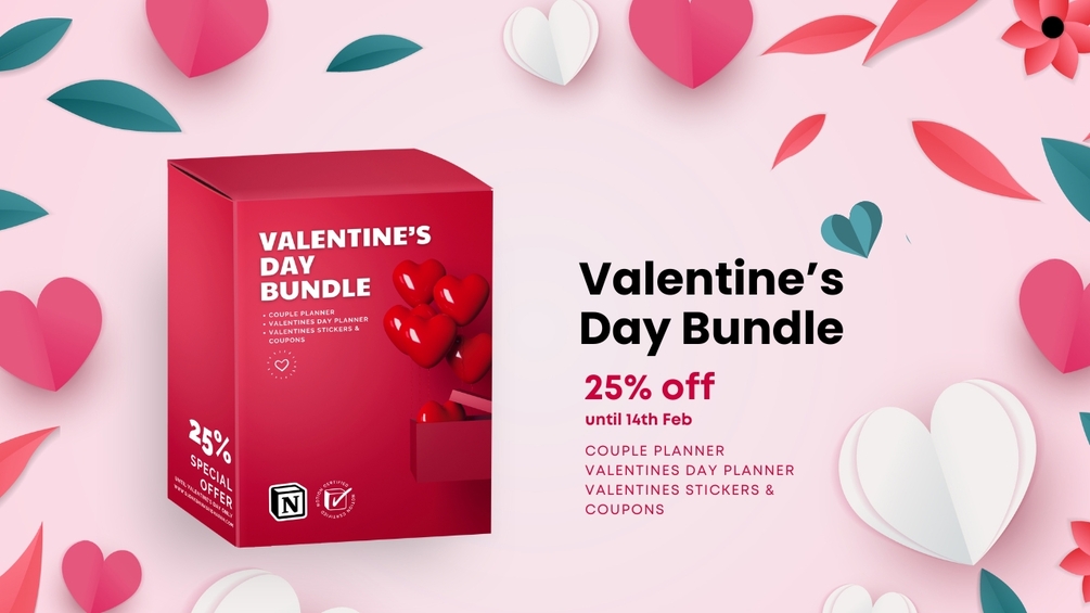 Embrace the spirit of love this Valentine's Day with our exclusive bundle, combining the best of planning and romance. For a limited time only, get our premium Couple Planner, the enchanting Valentine's Day Planner, and a delightful set of Valentine Stickers at an unbeatable price. Make this Valentine's Day unforgettable with a touch of organization, creativity, and lots of love!
