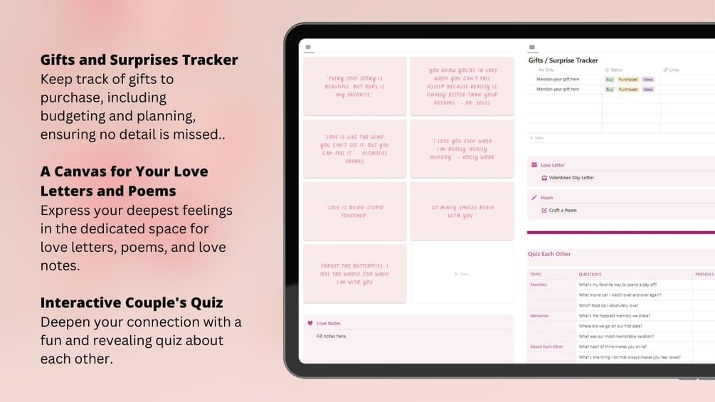 - Interactive Couple's Quiz: Deepen your connection with a fun and revealing quiz about each other.